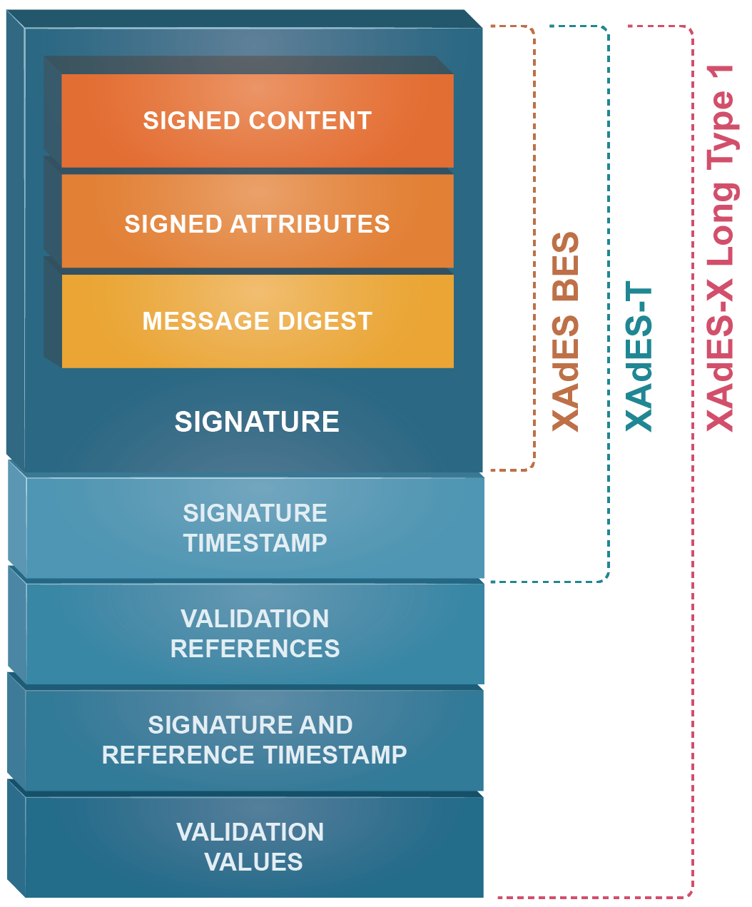 The ES-X LONG Type 1 (Extended Long Electronic Signature with Time Type 1) signature is based on the ES-T signature. In addition to ES-T signature, it includes the root and sub-root certificates of the certification authority and the CRL and OCSP responses for signature verification. This enables the signature to be validated for a long period of time.