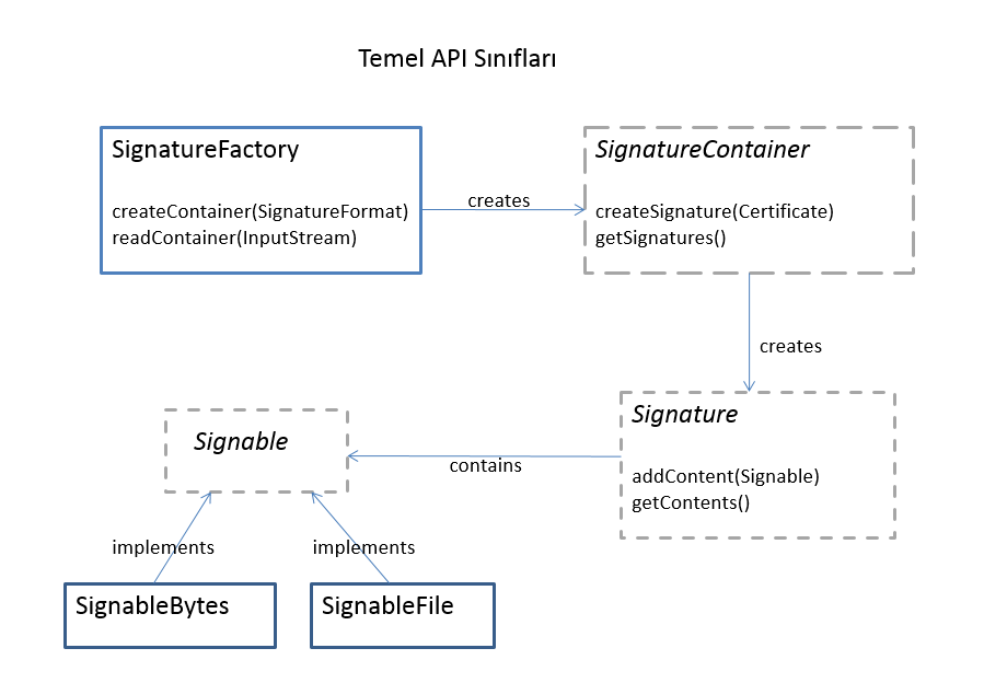 Bir kişinin ıslak imzasının, programlama arayüzü karşılığı Signature, bir yada daha fazla imzayı içinde barındıran yapı SignatureContainer İmza formatına göre SignatureContainer yaratma amacı ile kullanılan arayüz SignatureFactory'dir.